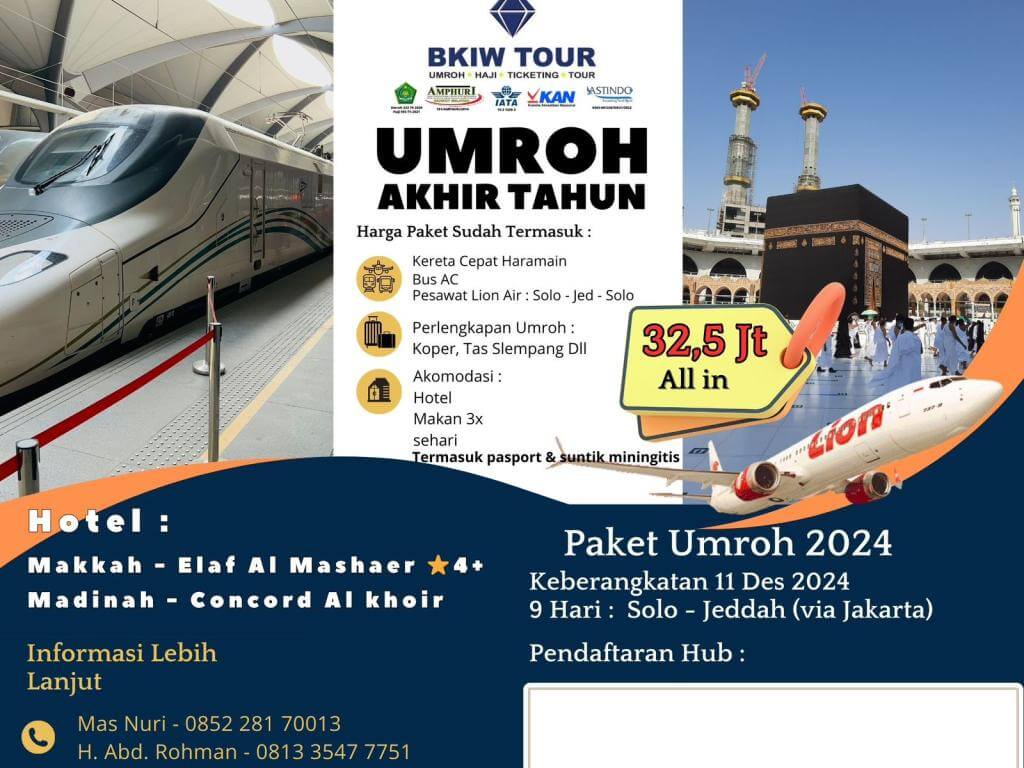- Perlengkapan Umroh (koper bagasi, koper kabin, tas slempang, tas serut, kain batik, kain ihrom/ jilbab, buku doa, buku panduan, id card)